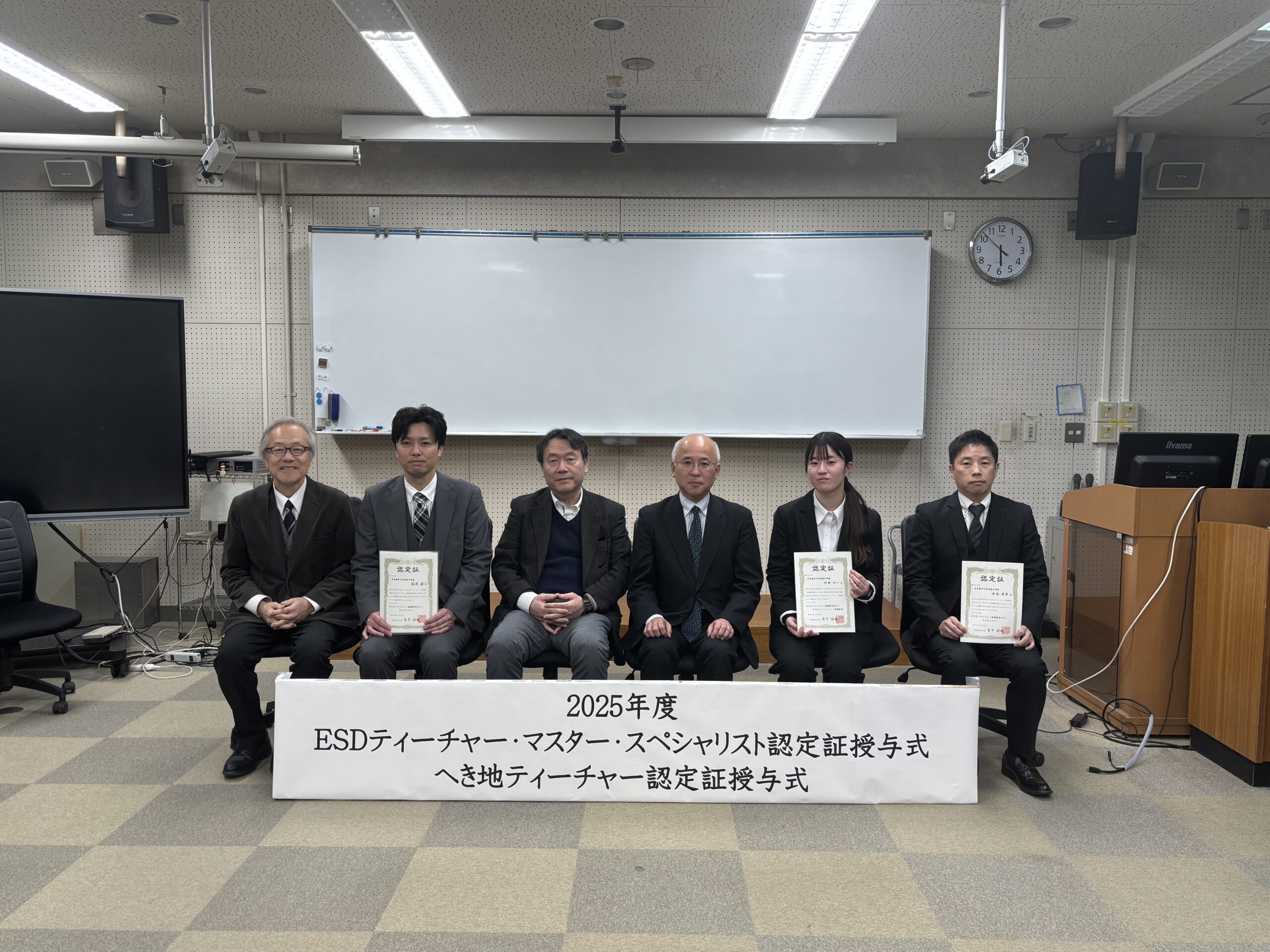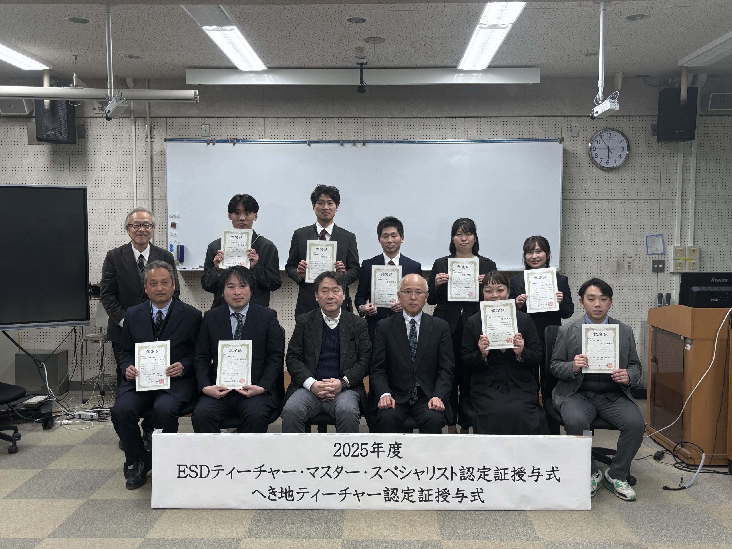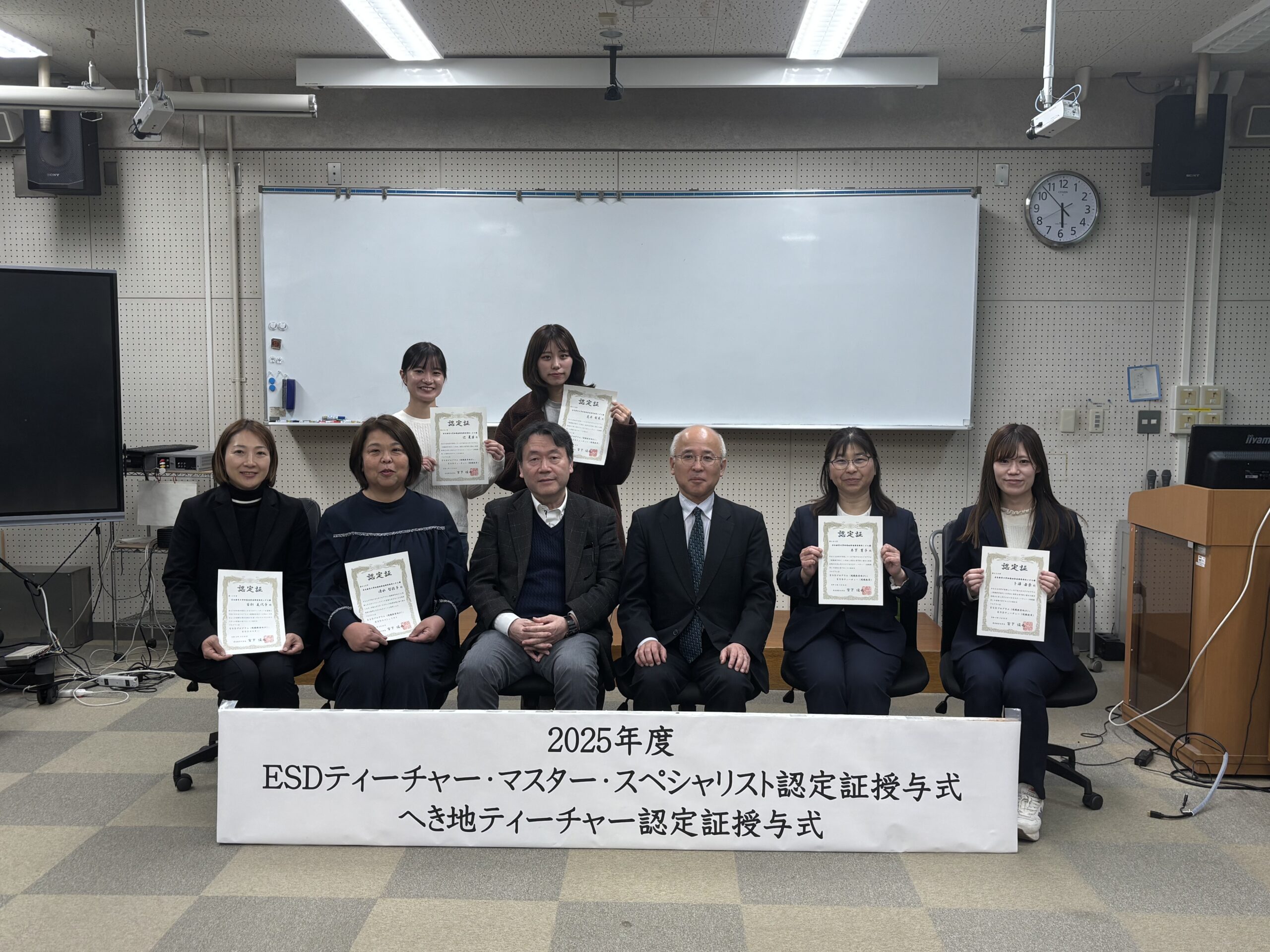 3月24日(木)、本学ESD・SDGsセンターでは「ESDティーチャープログラム」、「へき地教育・地域創生プログラム」の修了生に対し、「ESDティーチャー・マスター・スペシャリスト」、「へき地教育ティーチャー」の認定を行い、認定証授与式を執り行いました。